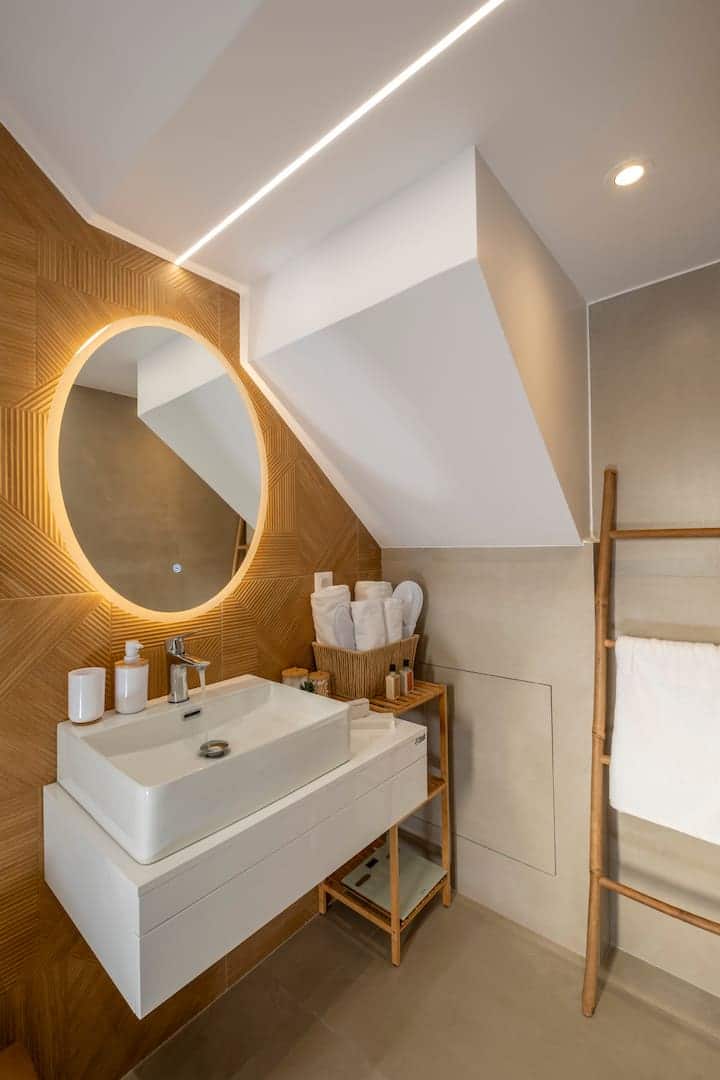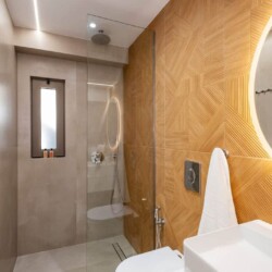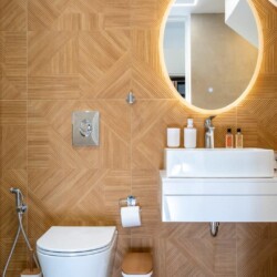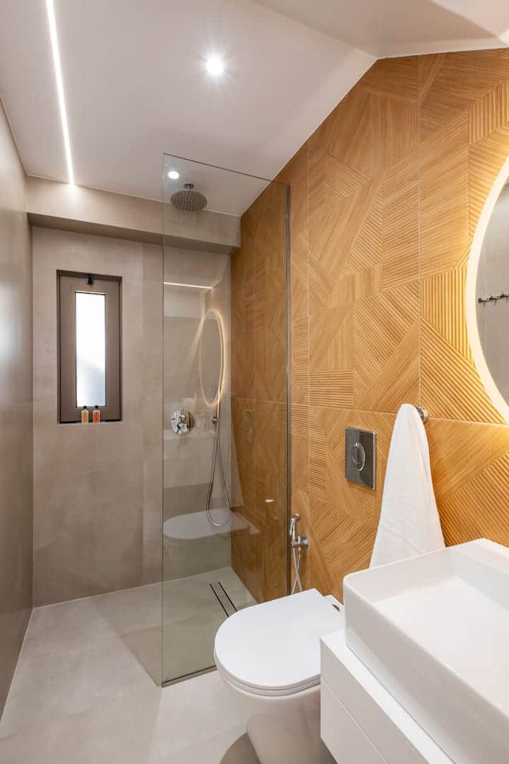 Next to the living room, you’ll find a stylish and functional bathroom, complete with a shower, sink, and toilet.