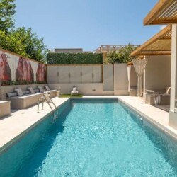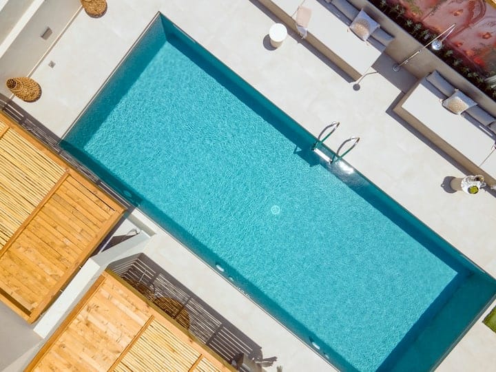 Through the balcony door in the living room, you’ll step into the shared pool area, which is shared with two other apartments. The outdoor space is carefully designed with a focus on peace and relaxation. Each apartment has its own private outdoor sofa and a table with two chairs, ideal for enjoying your coffee or drink by the water. The accommodation provides free linen, towels, free Wi-Fi access, private parking , a clothes rack, a hairdryer and iron.