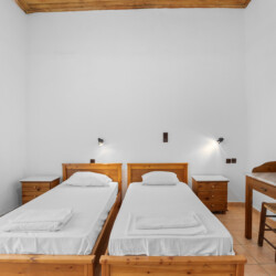 Walking further into the apartment, you’ll find the bedrooms awaiting you. The first bedroom features two single beds, a spacious wardrobe, and its own private bathroom complete with a shower, air conditioning, and a small private balcony where you can soak in the tranquil surroundings.