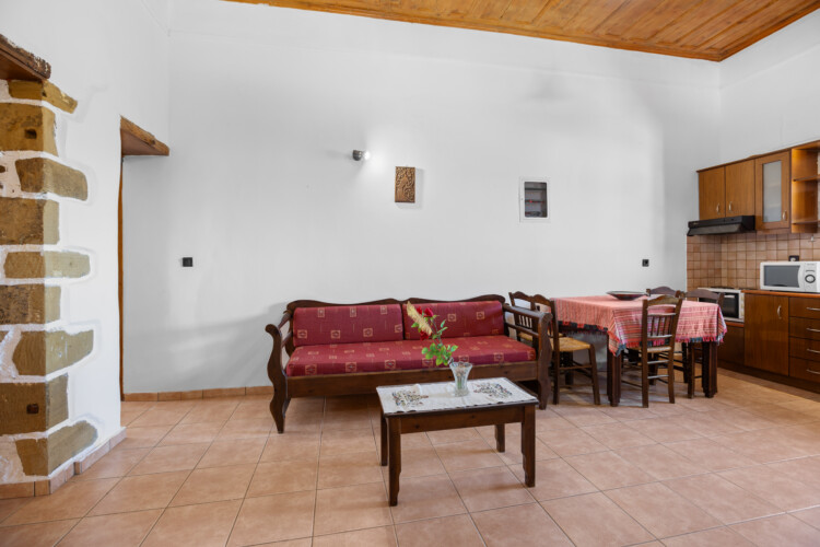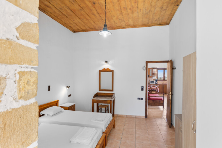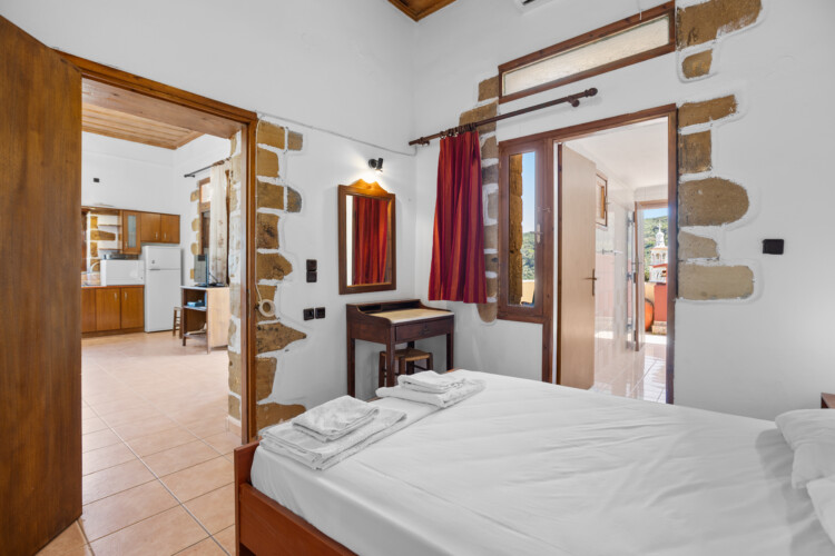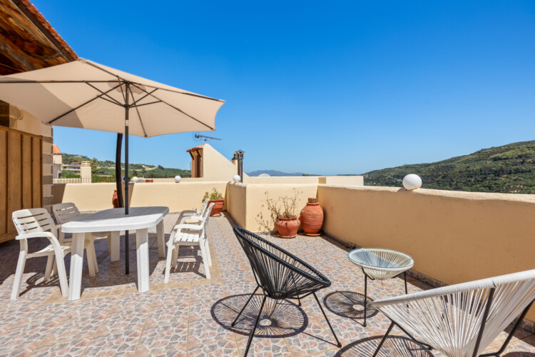 Outside, the shared balcony awaits, offering stunning views and the opportunity to mingle with fellow adventurers. Whether you’re a family seeking tranquility amidst the charm of Cretan villages or a couple eager to explore the wonders of the island, our top-floor apartment provides the perfect setting for an unforgettable escape.