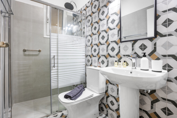 The second bathroom features a bathtub, sink, WC and a washing machine.