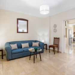 As you enter the apartment, you’ll step into the spacious living room, fully equipped with two sofas, A/C, and a TV for relaxation and entertainment. Adjacent to the living room, you’ll find the fully equipped kitchen, which includes a refrigerator, oven, filter coffee machine, coffee pot, blender, microwave, kettle, toaster, and a dining table where you can enjoy your meals.