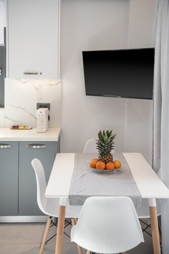 Living room: Furnished with a flat-screen TV and a dining table, providing a comfortable space for relaxation and dining.