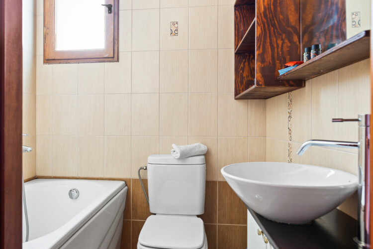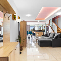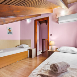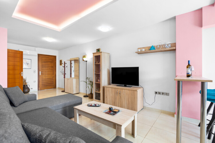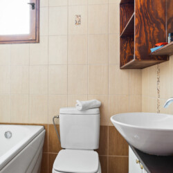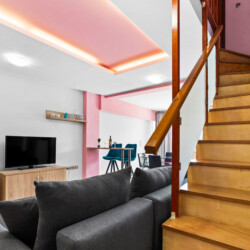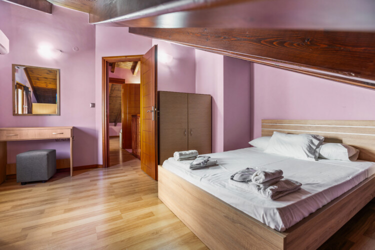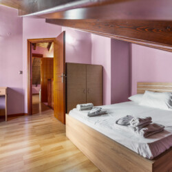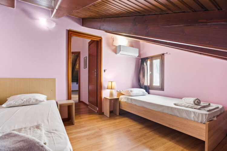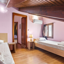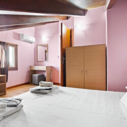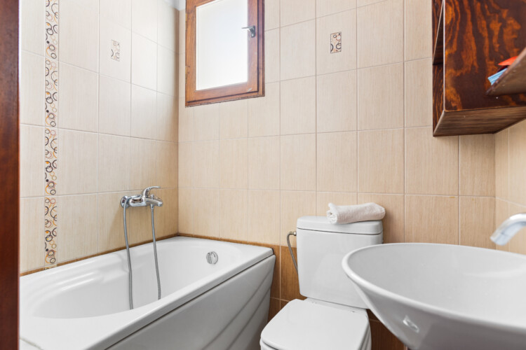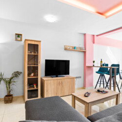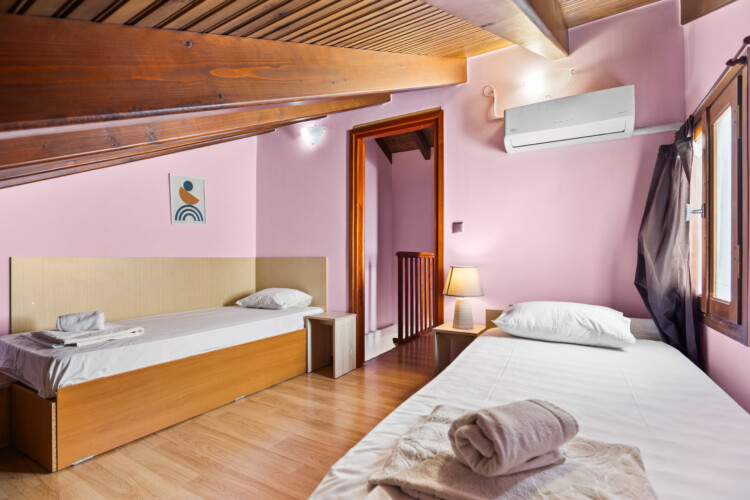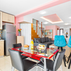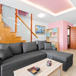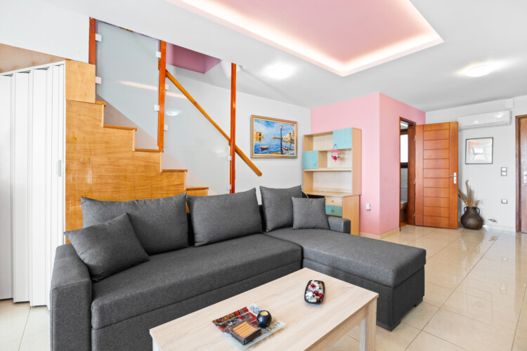 Maisonette can host up to 5 guests, as it consists of two bedrooms and a sofa-bed which we can make it as a bed. As you get into the apartment there is the living room with a sofa bed, a Smart TV with Netflix, a clothes rack, A/C, an office desk, a bathroom with a shower and washing machine. Next to the living room there is a dining table and a fully equipped kitchen area with a refrigerator, a kitchen, an electric kettle, a toaster, blender, a filter coffee machine and an espresso machine.There is a private balcony equipped with outdoor furniture such as a table and chairs, where you can relax and enjoy the sunset.As you go on the upper floor, you will have the opportunity to feel comfortable in any of the two bedrooms, one bedroom with a double bed, one with 2 single beds and air conditioning in each bedroom. There is also a bathroom with a bathtub.The accommodation provides free linen, bath towels, free Wi-Fi access, iron with ironing board, hairdryer and parking on the public road.
