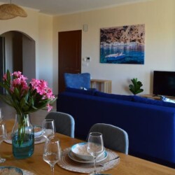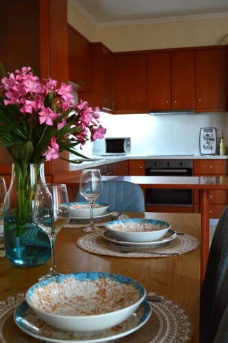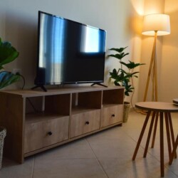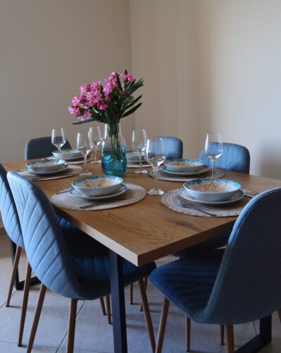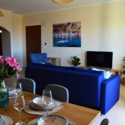 Moving further into the home, you’ll find a well-appointed kitchen, fully equipped with everything you need for culinary adventures. From a fridge to keep your groceries fresh to cookers for preparing delicious meals, and a filtered coffee machine for your morning brew You’ll find all the necessary tools at your fingertips to prepare your meals . Adjacent to the kitchen is the dining area, where you can gather with loved ones to share meals and create lasting memories. The open layout seamlessly flows into the living room, creating a warm and inviting space for relaxation and socializing. At the balcony there is a set of outdoor furniture to relax and enjoy the sea view.