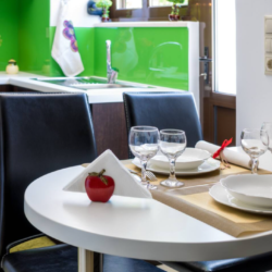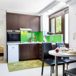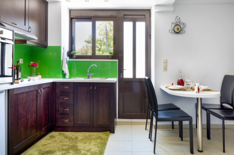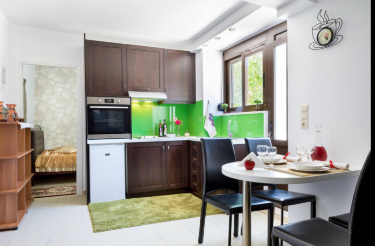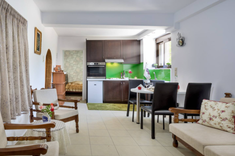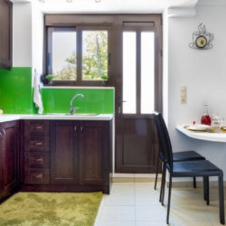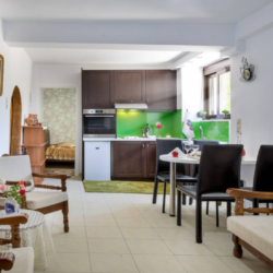 At Panethimos House you will find once you enter, a dining table at the wall with comfortable seating and a kitchen space inside the open plan living room.