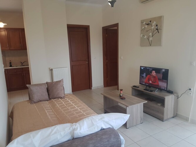The apartment is situated into a fantastic area with mountain and sea view with easy access at the national road only 500 meters away so you can easily visit the beautiful beaches of Falassarna, Elafonissi, Balos, Gramvousa but also other lovely tourist sites of our city. The touristic areas of Agia Marina and Platanias is only 2 km away. At 800 m there are super markets (SYNKA, LIDL), a pharmacy, restaurants-taverns and different kinds of stores for your shopping. Also at 100 m there is a small super market for your basic needs.