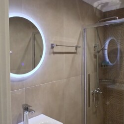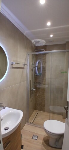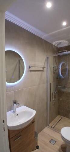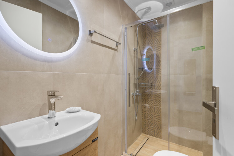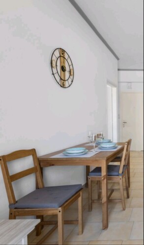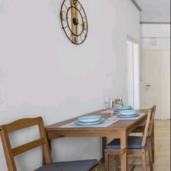 As you step into the apartment, you’ll find yourself in a welcoming living room, featuring a versatile sofa bed that easily transforms into an extra sleeping area, ideal for accommodating additional guest. The kitchen, adjacent to the living room, boasts a cozy kitchen table perfect for enjoying meals together.