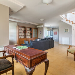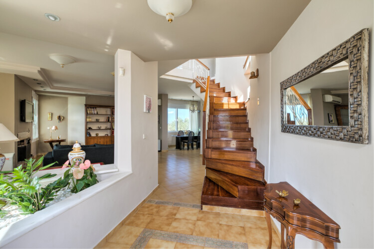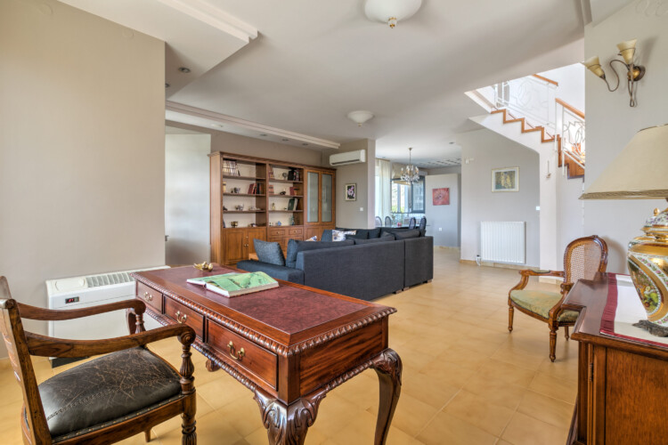 The villa includes two fully equipped kitchens with a big and a small refrigerator, a dishwasher, a washing machine, a microwave, a kettler, etc. There are interior stairs, five bedrooms with new anatomic mattresses, 26cm thick., two living rooms (a large and small one), two dining rooms with flat screen TV sets in each room that include all the satellite channels and also, three fully equipped indoor bathrooms plus αn outdoor one. All the rooms are equipped with air-conditioning and also have central heating and a fireplace for the winter, so the villa is suitable for quests all year round. The Villa is fully renovated, with new, modern electrical appliances to make your stay convenient and functional.