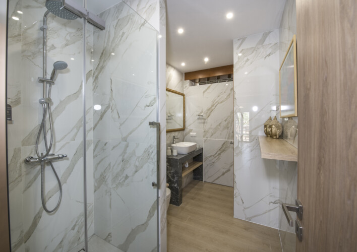 The highlight of the house is the exclusive private garden with grass and a patio between the house and the garden. Just relax all day in the patio’s sitting area of the house, prepare your meal at the charcoal BBQ, keep your fitness on the treadmill facing the garden, or have a bath in the Jacuzzi tub with a refreshing cocktail in your hands.